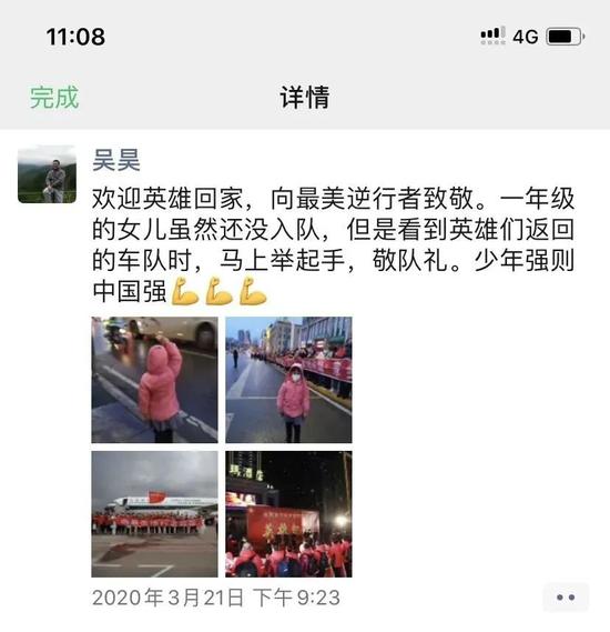 来源:黑龙江晨报 原标题:占了《人民日报》一个整版的黑龙江小女孩,她是谁? 3月26日,一个小女孩的背影登上了《人民日报》16版,并占据了整个版面。在这张名为《致敬英雄 感恩时代》的照片中,一个小女孩背对镜头,当路上载有26名双鸭山市援鄂医疗队员的大巴凯旋时,她高高的举起自己的右手,以标准的少先队礼向白衣天使致敬! 她是谁?这张朴素却让人心头一暖的照片是如何被捕捉到的?记者探寻了照片“背后”的故事。 ![]() “爸爸的小棉袄,温暖了朋友圈” 照片中的小女孩名叫吴莫忧,是双鸭山市师范附小的学生。开学后,她和其他小朋友一样,每天在家里居家网课学习。“我们家里始终关注着疫情相关的新闻,当知道双鸭山市援鄂医疗队凯旋而归时,我决定带着女儿一起欢迎英雄们回家。”吴莫忧的父亲吴昊告诉记者。 3月21日,春寒料峭中,吴昊和女儿的心头却是暖烘烘的。等待良久,当载着医护人员的车队缓缓进入爷俩儿的视线时,守在道路两旁的双鸭山市民欢呼着举起自己的大拇指。这时,令吴昊的意想不到的一幕发生了,寒风中,只有7岁的小莫忧立刻立正站直,举起右手,庄严地敬了一个标准的少先队礼,吴昊则举起自己的手机悄悄记录下这一难忘的瞬间。 ![]() ![]() “没有人教她怎么做,孩子的举动是发自内心的,我被自己的小棉袄感动了。”吴昊笑着说,回家后,他把自己拍摄的“敬礼”照片和小视频发到了朋友圈,并配文“少年强则中国强”。 就这样,本来只是发在孩子父亲朋友圈的几张“晒娃”图,就这样被传到了双鸭山日报记者张涵的眼中,他立刻联系到吴昊,制作了《小女孩致敬英雄》小视频。截至目前,该视频在双鸭山日报抖音号的播放量目前已达到57万,点赞达6万次。 “看到国旗,她总会这么做” 小莫忧今年7岁,一年级的她虽然目前还没有加入少先队,但每当学校周一升旗仪式时,面对冉冉升起的五星红旗,看到高年级的哥哥姐姐们戴着红领巾敬队礼时,她总是很羡慕,或许鲜红的“种子”早就她心中萌发了。 “莫忧心思比较细腻,用咱东北话说,是个心里有数儿的孩子”母亲付佳说,孩子从小就没让她操过什么心。 这已经不是孩子第一次让父母有过惊喜之举了。“去年中华人民共和国成立70周年阅兵式上,国歌响起时,她也站在客厅里对国旗敬礼了。”付佳说。 在“敬礼背影”被更多媒体转载之后,很多人把图片和视频转载到自己的社交媒体,很多学校也把此视频发到学校微信群让学生们树立正确的人生观、价值观。 “孩子还小,我们能做的是以身作则,给她树立正确的人生观,价值观,同时也不想给孩子过多压力,我们相信很多孩子会做出和我女儿一样的举动,”付佳表示,她和丈夫珍藏了26日的《人民日报》,打算在女儿成年时,连同她出生当天收藏的《人民日报》一起交给她,告诉她不要忘记这段有意义的人生旅程。 “爸爸妈妈是党员, 也是更多小朋友的守护者” 吴昊和付佳夫妻二人都是双鸭山市事业单位的普通职工,这两个80后党员从2月就主动请缨下沉社区一线,冲锋在前,全力以赴打赢疫情防控人民攻坚战。 ![]() 然而,知道爸爸妈妈都要离开家去社区一线工作时,孩子哭了。“爸爸妈妈有危险怎么办?你们可不可以不要去?”孩子紧紧抱着妈妈。 孩子的眼泪让父母揪心,怎么安抚宝贝女儿,还是付佳在行。“爸爸妈妈会保护好自己,就和电视里穿着白大褂的叔叔阿姨一样,去守护更多小朋友的家庭呀。”于是,付佳白班,吴昊夜班,50多天来,两人轮流在社区一线值班,测体温,登记出入人员,劝返多次出门遛弯却不戴口罩的老人家… ![]() 2月22日,吴昊的朋友圈在凌晨5点更新了:“听了一夜雪落的声音,白雪覆盖下的车灯,点亮深夜里的一道微光。” 微光过后是即将到来的黎明,每一份爱和努力,都是冲破疫情云翳的一道曙光。在这场14亿人民共同打响的抗疫战中,每个背影的身后都可能藏着一个动人的故事。这一个个美丽的背影,组成了中华民族挺立风雨的坚强脊梁。 来源:人民日报客户端黑龙江频道 |