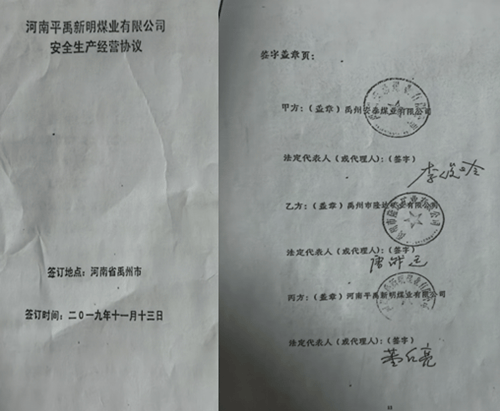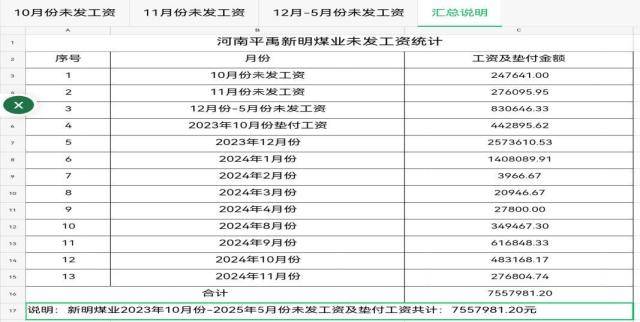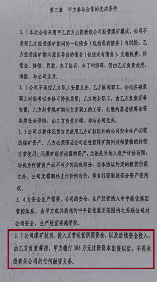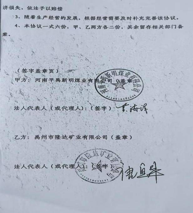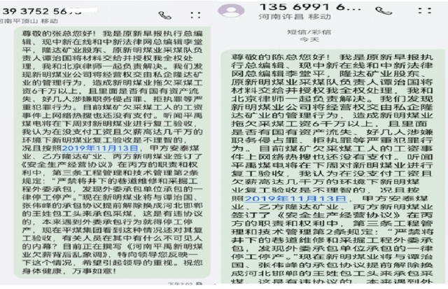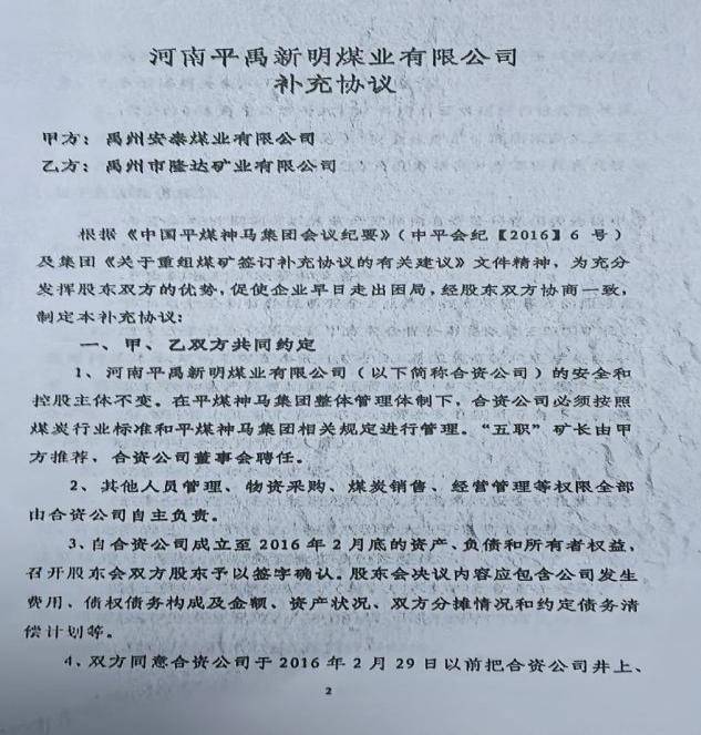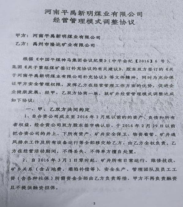 河南平禹新明煤业欠薪乱象调查之一:经营管理混乱 不合常理 独立撰稿人 李堂平 2024年12月8日,多家网络平台出现题为《河南平禹新明煤业:拖欠300工人的辛苦钱何时给》的网帖,反映河南平禹新明煤业有限公司(下称“新明煤业”)长期、大规模拖欠农民工工资问题。至今,欠薪问题仍未解决。那么新明煤业的钱去哪儿了呢?!撰稿人为此联系了新明煤业采煤队负责人谭治国等人,了解到了新明煤业公司该事件背后的企业治理与经营乱象。 一.事件核心:巨额欠薪至今未解 平禹新明煤业工人代表们人反映,该公司从2023年至今拖欠其施工队农民工工资及各项垫付款项累计近1500万元:尽管工人多次追讨并向有关部门反映,问题始终未获解决。 1月8日网络曝光了《河南平禹新明煤业:拖欠300工人的辛苦钱何时给》、在给“豫事办”反映情况后,禹州市人社局及豫事办工作人员电话表示不属实只欠66万元,主要原因是矿井在发放工资时,部分职工由于外出打工等因素未能到现场实名签字;区队工资册上职工姓名和工资卡不一致,导致签了字的部分职工工资未能上卡;部分职工银行卡限额,导致工资不能上卡。法询君联系工人代表后表示是乱说,于是发出《河南平禹新明煤业公司欠农民工血汗钱上热搜 许昌市禹州市政府无动于衷?》。之后“豫事办”表示重新调查,给撰稿人电话时表示禹州人社局没有和工人代表调查,光重庆籍20多名工人就有70万元工资没有发放。 综采管理员周浩手里多张工人们的欠条达30多万元,现在都各散五方 “豫事办”工作人员在1月5日下午三点电话撰稿人,说答复情况和以前一样。撰稿人表示工人向包工头等人借支的700万元左右被当作工资发放,这个是不合理的,矿方应该发放这些工资。她回复说不满意会如实记录,然后挂断电话。之后豫事办回复民营方资金充足,有些工人没有来核对签字只差37万多元,有工人没进入调度和出勤记录,有冒领工资行为已报警。 对于此回复,周姓工人代表说:矿方虚假陈述,他们有多个工人没有培训上岗了,矿上是冒名顶替,不知道背的谁的定位仪。如此管理,怎么能实名呢? 农民工周志华说他培训后有上岗证,但矿方却没有记录,上班多月,也不给发工资。图为周志华的安全帽和柜子。 而包工头谭治国说2024年的至今还有129人没有发放,加上他的垫付工资还下欠700万元左右。 二.问题重重,新明煤业依旧通过复工复产验收 更令人想不到的是,2025年12月29日,在工人投诉后禹州市政府还在调查处理的情况下,中国平煤神马集团仍对新明煤业进行了复工复产验收。 其实在12月26日上午,撰稿人和包工头、工人代表给平禹煤电程洪涛总经理、平煤神马集团张浩发送短信遭遇置之不理。在验收当天下午五点,撰稿人给程洪涛打电话也没有接听。 12月30日,本网及多家网站、视频平台发布了《平禹新明煤业问题重重,平煤集团执意验收为哪般》。1月7日,许昌时刻公众号发布了记者采写的《河南平禹新明煤业有限公司顺利通过复工复产验收!2026年,撸起袖子加油干!》 1月9日,新明煤业公司股东会在平禹煤电公司召开,平禹煤电公司董事长程洪涛在会上指出:公司严禁井下采煤队外包,否则一律停工停产。 1月11日,谭治国给禹州市应急局上报了《关于平禹新明煤业公司复工复产验收的情况反映》,指出不能复工复产验收的三点理由。同日,谭治国还通过“豫事办”向禹州市田会卿市长提交了相似内容的情况反映,只是请求内容变为五条。 12日,法讯网发布了《河南平禹新明煤业有限公司顺利通过复工复产验收,能撸起袖子加油干吗》,全文刊发了谭治国给禹州市应急局的情况反映。 然而,禹州市应急局还是于13日到新明煤业公司进行复工复产验收。验收现场安保囧常,公司内保安众多,被欠薪的煤炭工人拍照都被删除。 1月15日9点多禹州市应急局人员给谭治国电话说:其五条内容市里很重视逐条答复,谭对其回复均做出了阐释。应急局人员答复后续会安排纪检李书记带队算账。股东纠纷、工人工资、谭治国投入资金等问题不解决,即使按照要求通过了验收,也不能复工复产。 三.企业背景:简单的重组与纯收入的管理模式 平禹新明煤业成立于2010年9月,是禹州市隆达矿业有限公司(民营,涉多起失信与司法案件)通过兼并重组后,与国有企业平禹煤电公司(后股权转入其全资子公司禹州安泰煤业有限公司)合资成立的企业。股权结构一直为:国企方安泰煤业持股51%,民营方隆达矿业持股49%。 河南煤改是河南省政府于2010年依据《河南省人民政府印发关于加强煤矿安全生产若干规定的通知》(豫政〔2010〕17号)和《河南省煤炭企业兼并重组实施意见》推出的煤炭企业兼并重组政策,旨在整合年产15万吨至30万吨的中小煤矿,组建3个年产5000万吨的特大型煤炭企业,实现骨干企业控制全省85%以上煤炭资源量的目标。 禹州市隆达矿业公司于2007年9月30日成立,属于民营小煤矿。在禹州市政府见证下,中平能化集团下属企业平禹煤电公司和禹州市隆达矿业公司在2010年6月5日签订了《合资协议》。协议确定双方共同出资设立公司,合资开发隆达矿业名下煤矿煤炭资源,公司注册资本为600万元,甲方平禹煤电出资306万元占股51%,乙方隆达矿业以矿权作价294万元占股49%。协议中明确了井田面积为1.5578平方公里,剩余可采储量288.6万吨。经评估确认隆达矿业的矿权为943.72万元