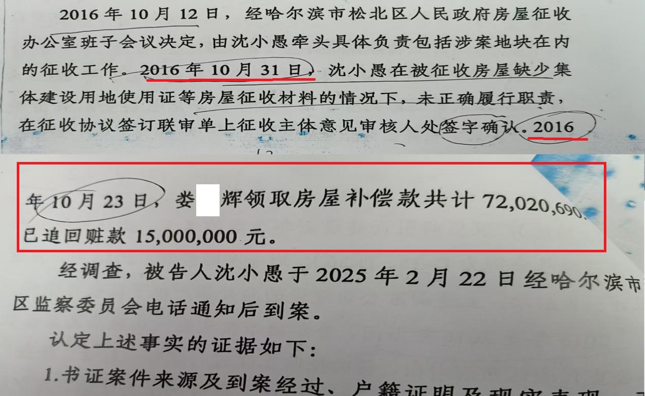 | 哈尔滨高新区:7千多万拆迁诈骗案再起波澜,原征收办副主任当庭举报纪委书记 文 李海波 10年前哈尔滨一起高达7千多万的拆迁诈骗案又起波澜:原征收办副主任沈小愚被控玩忽职守,而核心证据,都显示和被告人沈小愚无关。 4月1日上午近10点,沈小愚出现在松北区法院第十七审判庭,法院对他涉嫌玩忽职守一案公开审理,至晚上8时庭审才结束。这个小案子本来应该不会超过5小时就会结束的,却花了9个小时!因为沈小愚和辩护律师针对公诉人提供的证据,逐一进行了阐释和反驳,让起诉书指控的内容漏洞百出…… 拆迁 企业获赔7千多万元引发的诈骗案 多人判刑 2012年,哈尔滨市松北区启动万达文旅城项目,松北镇对辖区进行征地拆迁补偿工作。由于德辉公司是招商引资企业,在拆迁中有一处房产权属一直没有定性,拆迁工作难以推进。直至2016年镇政府在公司提供相关资料后,按照区政府文件“一事一议”下确定了非住宅的权属后才得以顺利拆迁补偿。 2019年5月松北警方立案,直到2022年12月12日松北区法院才下达黑0109刑初176号刑事判决书(刑终258号刑事裁定书维持原判)认定:廉某军、娄某辉构成诈骗罪故意提交虚假证明材料,误导松北镇政府作出错误认定,发放了7200余万元拆迁补偿款。二人被判诈骗罪获刑15年,并出罚金50万,评估员赵某洋因出具证明文件重大失实罪被判刑1年零5个月。 之后法院以刘某东、顾某彬等人构成玩忽职守罪判刑,主要原因是其作为松北镇相关工作人员,具有材料真实性核查、房屋性质认定的法定职责,却未履行该职责,导致虚假材料被采信、错误认定被作出,其行为与损害结果之间存在直接因果关系。 留置 地毯排查 查出10年前重大“问题” 2025年2月22日上午8点,松北区纪委电话通知沈小愚去纪委谈话,之后被留置。 留置后纪委监委对其父母、姐姐姐夫等家属的所有财产情况进行地毯式排查,没有查出沈小愚有任何经济问题。对其涉及德辉诈骗案中玩忽职守,他多次明确的表示与事实不符。 4月7日,感觉得不到公正处理,沈小愚向松北区纪委明确申请提级办理。6月24日,沈小愚被批捕。10月27日,松北区监委向检方移交了沈小愚在德辉案中的涉嫌玩忽职守。 专家 沈小愚不构成玩忽职守罪 法庭上,沈小愚辩护律师向法院提交了由中国政法大学、清华大学和北京师范大学三位法学教授对此案进行论证的法律意见书,意见书做出明确结论:沈小愚不构成玩忽职守罪。 庭审 滔滔不绝的被告 激昂陈词的律师 拍桌反对的公诉人 2025年12月12日,松北区检察院向区法院移送审理。公诉机关认为沈小愚存在两项核心失职行为:一是2016年10月11日,沈小愚列席参加松北镇党政联席会议,该会议决定对德辉公司涉案两处房产按照非住宅予以征收补偿,沈小愚在参会过程中未正确履行监督指导职责,未对该决议提出异议,导致错误决议得以形成;二是2016年10月31日,沈小愚在明知被征收房屋缺少集体建设用地使用证等关键权属证明材料的情况下,未正确履行审核职责,在征收协议签订联审单上征收主体意见审核人处签字确认,导致德辉公司骗取巨额征收补偿款,公共财产遭受重大损失。公诉机关认为,沈小愚构成玩忽职守罪。 在庭审中,公诉人提供的证据包括了联席会会议纪要、联审单、区政府42号、60号文件、生效的法院判决书及诸多证人证言等。对此沈小愚逐条进行了辩驳,他指责公诉人对其提供的文件及证人证言有选择性的摘取,而对被告人有利的内容没有说出来:对于拆迁需要土地证他多次提到拆迁不是必须要土地证,从提供的政府文件就可以看出;多数证言说明了沈小愚是参加的协调会而不是党政联席会…… ![]() 党政联席会会议纪要:没有沈小愚名字出现 对于2016年10月11日参会,沈小愚说他是按照主任丁某超的通知,陪同郑某龙副区长参加其在松北镇组织召开的房屋征收工作推进会,是遵照高书记的会议指示去推进涉案区域房屋征收工作的进度,通报前期工作情况,协调解决工作中存在的问题,遵循郑区长“就是工作推进,不定事”的原则,不涉及具体事项的决策,会后他和郑副区长及后来的丁主任一道离开,并没有参加松北镇党政联席会议。 ![]() 刑事判决书认定的事实:二份党政联席会没有沈小愚 ![]() 生效的176号刑事判决书中的征收办主任丁某超、副区长郑某龙的证言:只对材料进行审核,真实性合法性由街镇负责。 ![]() 沈小愚签字的联审单,征收办只有他没有签署日期 对于在征收协议签订联审单上签字,沈小愚说第一次报给他签字时发现会议纪要存在问题,便找到征收办丁主任一道去郑副区长那说明了情况。之后报上来的联审单区征收办管理科负责人王某秋已对材料进行了初步审核并签字,主任丁某超也已签字确认,丁主任要求他也要签字,所以沈小愚才最后签了字,但没有写下签字时间:按实际时间写不合规矩,因为丁主任已经签字,作为副主任不应该在丁主任签字之后才签;时间提前签写又违规。 法庭上沈小愚说:如果说没有土地使用证不能补偿,那松北区有多起没有土地证都是按照程序进行了拆迁补偿的! ![]() 松北区政府60号文件规定非住宅房屋认定标准是“经镇征拆工作领导小组认定” ![]() 松北区政府42号文件明确镇、街道是房屋征收主体,对资料真实性准确性合法性负责 ![]() 2016年4月19日,德辉的房屋就被镇政府确认为“非住宅” 对于检察机关
