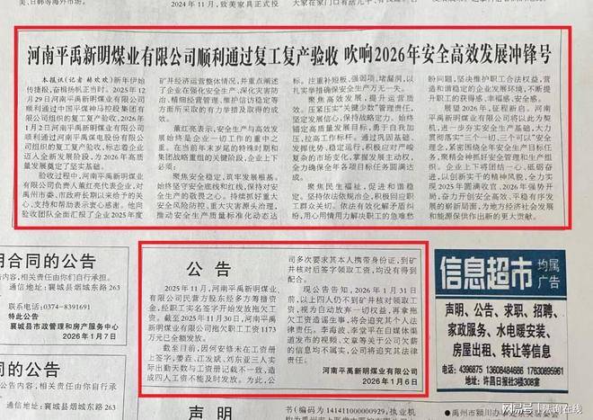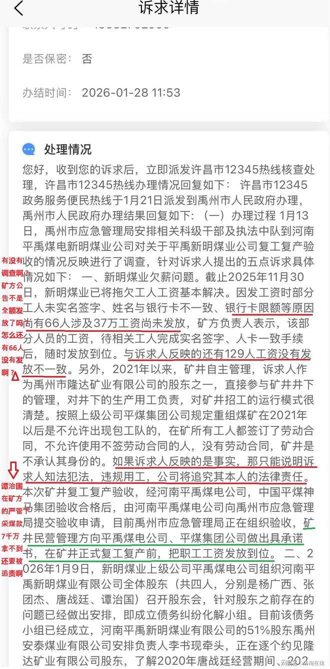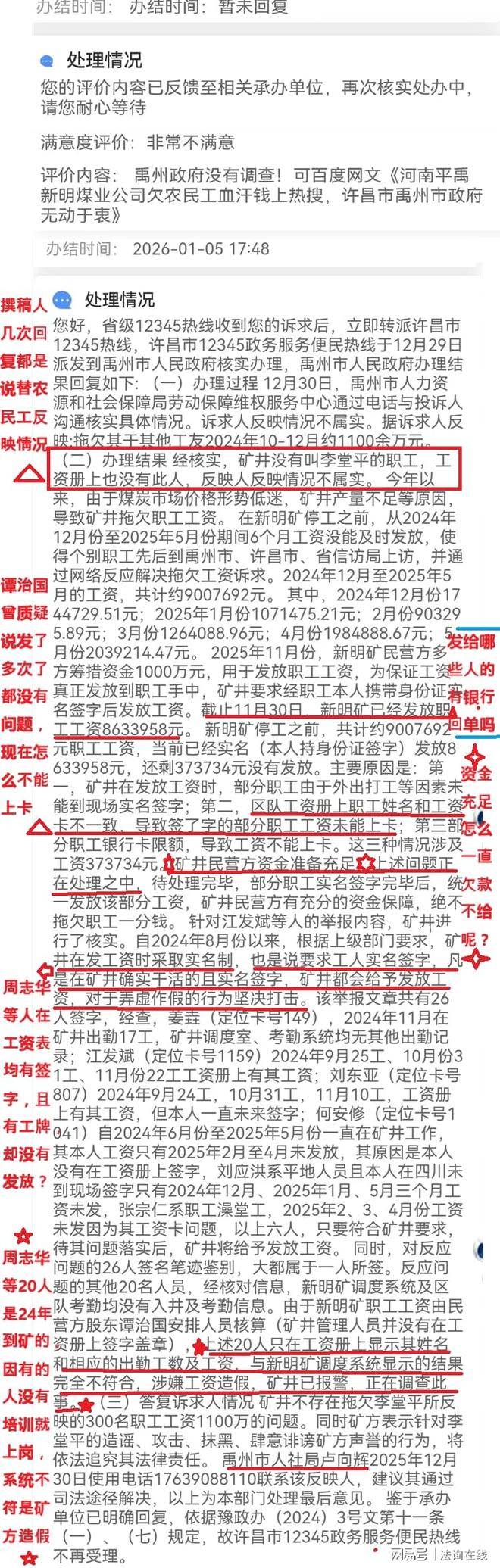 要过年了,河南平禹新明煤业那些农民工能拿到血汗钱过年吗 马上有钱!是国人们马年的最大愿望。都到腊月二十了,不少打工者已经回到了家乡,家家户户都在等待着过新年。但在河南平禹新明煤业公司,四川巴中的谭治国和几个工人还在苦苦等待着他们的血汗钱。 平禹新明煤业拖欠农民工工资在网上闹得沸沸扬扬,公司承诺的在2025年底之前发放也没有兑现。 之后撰稿人通过豫事办投诉到禹州市田会卿市长,在撰稿人指出是代农民工投诉后再次回复却依然说是不欠撰稿人工资,只有6个人30多万元没有发。并且说明:矿井民营方资金准备充足!而对于其他的20多名人员则是说非矿井人员,涉嫌工资造假,矿井已报警。 真是只有6个人工资没有发放吗?没有发放的几个人真是银行卡存在问题吗?在禹州市应急局领导给煤矿股东谭治国电话时,谭治国对此质问:“为什么发了几年的工资,银行卡都没有问题,现在怎么有问题了呢?” 真是存在工人冒领工资问题吗?报警了警方怎么调查处理的?目前还没有听说有农民工因此被处理,这是怎么回事呢? 图为周志华的安全帽和柜子。 看看,20多名重庆籍的农民工代表周志华没有拿到工资,他经过了矿方的培训,有工牌有柜子,在煤矿均有上班但怎么在调度里查不到呢?而周志华透露他们在井下培训时就是走过场而已:人、自救器、定位仪应该是一致的,当时有人在培训而有人在上班,所以培训5人就有2个人用的自救器、定位仪是别人的。同时,平禹新明煤业公司在培训考试时都是把答案写好了才发给培训人员。 1月11日,谭治国通过豫事办向禹州市田会卿市长提交了《关于平禹新明煤业公司复工复产验收的情况反映》,信里提出了5个诉求。之后禹州市应急局干部电话谭治国,而谭治国对其回复的五个问题都提出了自己的相应理由,但豫事办回复仍旧为应急局干部的单方面答复,丝毫不理谭治国的反映。谭治国在评论为极不满意后再次调查后回复依旧如前,只是将新来的采煤包工头王玉明的股东身份改为:合作伙伴。 谭治国提供的未发工资表显示的2023年10月-2025年5月未发工资和其垫付的资金为755多万元。 谭治国提供的平禹新明煤业2024年-2025年5月未发工资统计表 2024年10月工资表,有出勤天数应发工资和银行卡号。总共15页,计359人,其中有周志华应发工资12658.5元。 2024年11月未发工资表,其中有周志华应发工资12658.5元。 平禹新明煤业公司在1月24日的对账单显示,煤矿经营矿井仅支付了4589多万元,还下欠约700万元。既然民营方资金充足,为何不予以支付呢? 看看1月6日的《许昌日报》第二版“要闻”的公告吧,里面的公告显示拖欠的工人工资1173万元在2025年11月30日已全额发放。如果是这样,为什么那么多工人还多次到河南省信访局讨要工资呢?如此不负责任的公告,许昌日报审核了吗?再者,对于该版报道的《河南平禹新明煤业有限公司顺利通过复工复产验收 吹响2026年安全高效发展冲锋号》,谭治国表示是虚假新闻,将在春节后向河南省委宣传部举报。 1月26日,平禹新明煤业的农民工再次到河南省信访局讨要工资。 目前,谭治国和另外二个工人都还在禹州市等待了,希望能拿到一部分工钱,这样才能回到四川巴中的家,过年。 其实,煤矿将煤炭开采承包给谭治国,约定支付其开采资金每吨330元,工人工资等费用均由谭治国工队负责,只要矿方及时结算支付开采资金,就不会存在拖欠农民工工资之说,当然更没有冒领工资之说:因为这些,都应该由谭治国等人负责处理! 所以,解决新明煤业公司的农民工工资问题很简单,把应该支付给谭治国工队的开采资金解决了就可以!毕竟。你们也说了:目前民营方资金充足! 马年啊,马上有钱!衷心希望在新明煤业公司的那些川渝农民工能早日拿到自己应得的血汗钱,高高兴兴地过年!(撰稿人 李海波) |